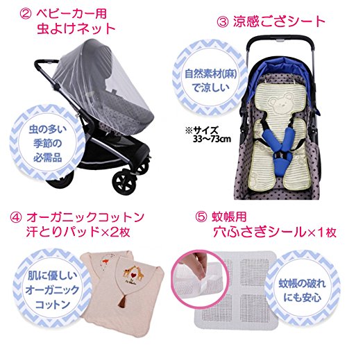 - 【セット内容】①蚊帳 ②ベビーカー用虫よけネット ③涼感ござシート ④オーガニックコットン汗とりパッド2枚 ⑤蚊帳用穴ふさぎシール
