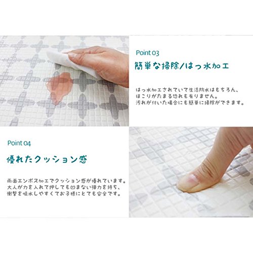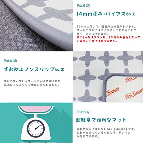 お子様が安心して遊べるように有害物資のない安全なPE(食品梱包材)素材。 厚さ14mmで騒音防止効果があります。はっ水加工で簡単お手入れ。 ズレにくい床面ノンスリップ加工。移動や保管に便利な1.14kgの超軽量マット。