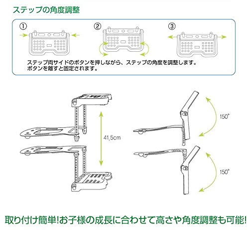 チャイルドシート用フットレスト。小さなお子様から大きなお子様まで対応で、足の位置に合わせて高さの調節・角度の調節が可能。