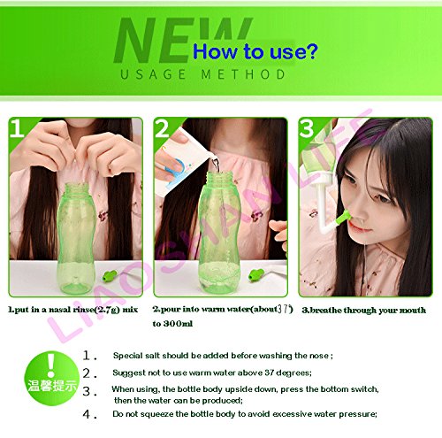 1セット:空気弁のスタイル鼻腔洗浄器(300ml)1個 +ノズル 2個 ユーザーマニュアル(鼻洗浄) 1:あなたの手を洗って、フィルの線まできれいな瓶に詰める(300 ml)は蒸留水またはぬるま湯以前の湯 2:その内容はビンへ注いで、鼻を洗って塩をカット、キャップとチューブ、ボトルに確実に回転する。指に置いて、キ ャップの先端の上のシェイクボトルの混合物を溶かすのに穏やかにします。 3:シンクの前に立って、あなたの快適さレベルを楽しみにして、あなたの頭を傾けます。あなたの口を開いて、息を維 持することなく、ぴったりの場所をキャップに対してあなたの正常な鼻孔とスクイズボトルに穏やかに解決を開始するまでの水 抜きをして反対側の鼻孔から、または、あなたの口から。 4:穏やかにあなたの鼻をかむことは、完全にあなたの鼻をつまんでしたので、これは鼓膜に圧力を適用します。 5:すぐにあなたの左の鼻孔のためのステップ3と4を繰り返してください。 として推薦だけを使用して、警告に従ってください: ワーミング:鼻通路を完全にブロックされるならば、あなたが耳感染症にかかっているかブロックを食べるならば、otリンス をします。