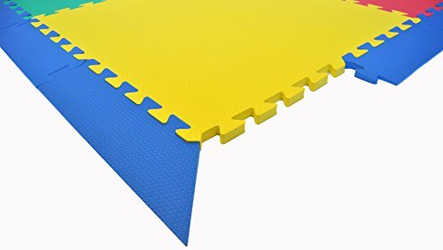36 piece 1ft x 1ft interlocking Wonder Mats in Red, Orange, Yellow, Green, Blue and Purple with 4 Blue Corners and 16 Blue Side Edges. Creates 36 square feet per set. Set up in seconds with easy do-it-yourself interlocking mats.;Wonder Mat's unique soft surface pattern is designed for children with sensitive skin while its texture provides grip.;Its ~9/16 of an inch thick exceeding the minimum protection requirement for children. Mats are waterproof and easy to clean with damp cloth and mild soap.;Made from non-recycled, non-toxic, light weight, durable, lead free and high density EVA. Lasts up to 10 years under proper care.;Passed CPSC standards, including tests and 53 substances of very high concern including toxicity report. Full test reports will be provided upon request.