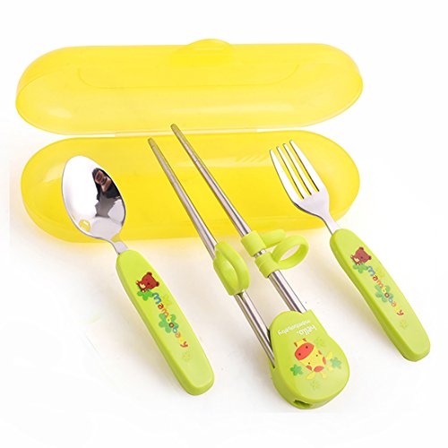 練習箸 キッズ用 トレーニング箸 子供用品 3点セット 右手用 ケース付き 箸、スプーン、フォーク  (グリーン)