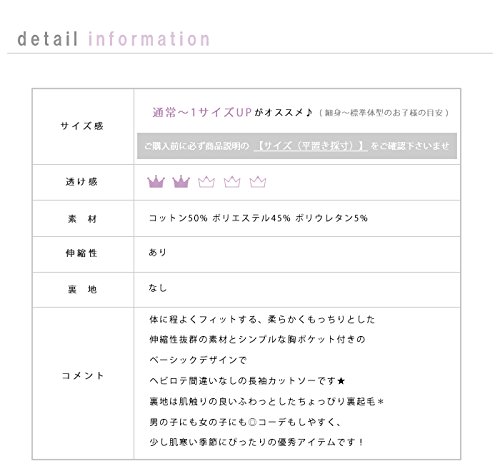 【カラー】#ベージュ#ブラウン#ダスティピンク#チャコール#サックスブルー#ダスティブルー#ブラック#ライトグレー#ネイビー#パープル#ストロベリーピンク#グリーン【サイズ(平置き採寸)】100cm:総丈 約36cm/肩幅 約23.5cm/身幅 約31cm/袖丈 約33cm110cm:総丈 約40cm/肩幅 約24cm/身幅 約33cm/袖丈 約34cm120cm:総丈 約43cm/肩幅 約25cm/身幅 約34cm/袖丈 約38cm130cm:総丈 約46cm/肩幅 約27cm/身幅 約35cm/袖丈 約42cm140cm:総丈 約48cm/肩幅 約28cm/身幅 約37cm/袖丈 約44cmこちらの商品は通常サイズ~1サイズUPがオススメ。子供服についてのご注意・ご説明はこちらをご覧下さい【素材】コットン50% ポリエステル45% ポリウレタン5%made in China【ご注意】■サイズをお選びの際はお手持ちのお洋服とのサイズ比較をおすすめします。 上記サイズは、実際の商品を当店スタッフが測っております。 ■海外製品は日本の商品に比べて縫製の基準が異なる為、縫い目や作り等が多少荒い商品もございます。予めご了承くださいませ。■商品画像はなるべく実際のカラーに近い画像を心掛けてはおりますが、お使いのブラウザの関係や撮影時の状況、 光の加減などによって掲載画像と実際の商品のカラーに多少色誤差が生じる場合がございます。【関連キーワード】60cm/70cm/80cm/90cm/100cm/110cm/120cm/130cm/140cm/150cm/160cm/XXS/XS/S/M/L/XL/XXL/ベビー/キッズ/ガールズ/ボーイズ/ジュニア/ママ/マタニティ/男の子/女の子/こども/子ども/発表会/卒園式/入園式/入学式/結婚式/発表会/長袖/半袖/ノースリーブ/お祝い/おでかけ/小さいサイズ/大きいサイズ/クラシカル/フォーマル/上品/カジュアル/通学着/通園着/北欧子供服/韓国子供服