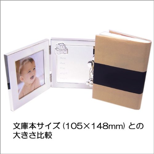 右側の刻印部分は、上から「Name」「Date」「Time」「Length」「Weight」となっています。写真は最大で約12cm×12cmのものが入ります。窓部分の大きさは約8.6cm×8.6cmです。折りたたんで収納することも出来ます。裏側はグレーのスエード調布張りになっています。吊り下げ用の金具が付いているので、壁掛けでもご使用できます。出産のお祝いにピッタリなギフトです♪