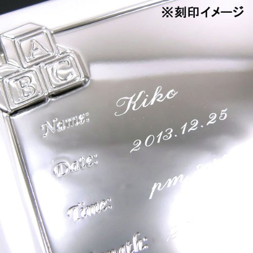 右側には風船を持ったクマのぬいぐるみやアルファベットの積み木。刻印部分は鏡面仕上げ、縁部分は爽やかなミルクホワイトカラーで色づけがされていて、清潔感を感じさせます♪