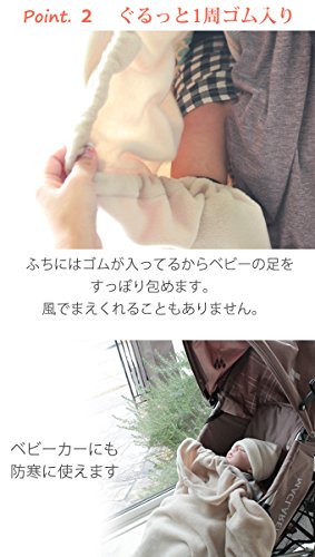 - ふちにはゴムが 入っているから ベビーの足を すっぽり包めます。 風でめくれること もありません。