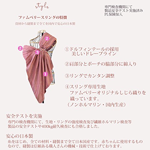 テール部分はドルフィンのテールをイメージさせるようなラインをしています。 一般的な直線のベビー用スリング(抱っこひも)のテール部分と比べてみてください。違いは一目瞭然。うっとりするほど美しいドレープラインです。 また、ママの肩にあたる部分と赤ちゃんがあたる部分(ポーチ部分の両脇)に綿が入っていますので、抱っこも楽々。これでママの肩の痛みは和らぎ、赤ちゃんにも優しい♪