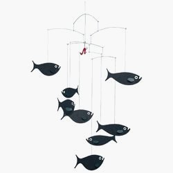 FLENSTED mobilesを代表する定番商品で、かわいい顔つきをした8匹の魚たちが、危険な餌の魅力に引きつけられています。お部屋の壁や天井に魚の影ができるように光を当てると、まるで水の中にいるような感じになって、幻想的な雰囲気が醸し出されます。釣り針には本物が使われています。