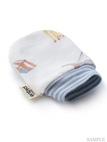 サーカスを楽しむアニマルモチーフの、babyミトン。ボーダー柄のリブがきゅっと手首に沿うから、取れにくいのもポイントです。同デザインのウエアトとお揃いで、更に愛らしく着こなしてほしいアイテム。