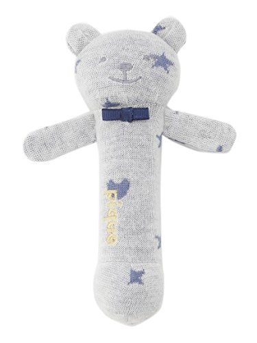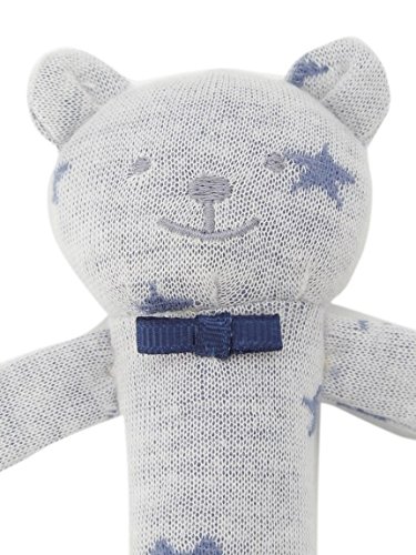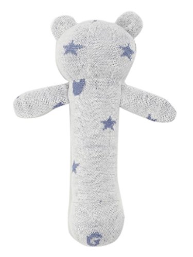 くまさんのデザインが可愛らしい、ガラガラぬいぐるみ。小さな手でもキュッと握れるフォルムで、早い時期から活躍します。スターなど複数のモチーフを散りばめた模様もチャーミング。