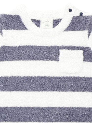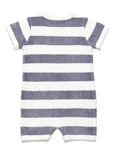 太いピッチのボーダー柄が、爽やかでシーズンムード漂う半袖ロンパース。袖部分にはゴールドのブランドロゴ刺繍があしらわれ、さりげないポイントになっています。ライトで締め付け感の少ないテキスタイルなので、ベビーも快適に過ごせそう。