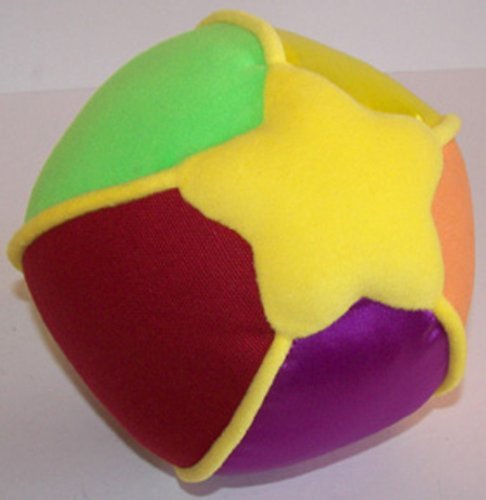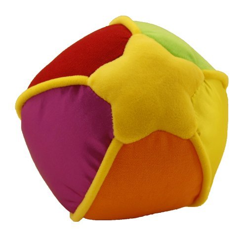 "Let's Play Catch" Jingle Jangle star chime ball. A child's first easy catch ball. This has ridges along the sides for easy clutching. It has a variety of textured fabric panels around it. This has features like listening to the gentle jingle inside, explore the various textures, soft and easy to squeeze and size just right at 6" diameter. It is appropriate from 6 36 months.