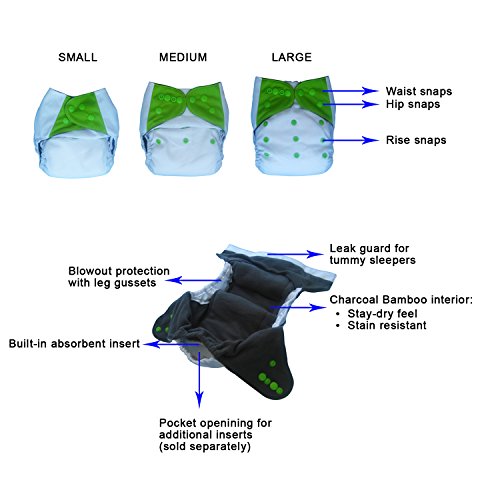 AIO Cloth Diapers are the easiest diapers to use. Reusable diapers already have the absorbent material sewn-in. No diaper cover required. No insert soakers stuffing required.;The ecoAble AIO Cloth Diapers are lined with the soft charcoal bamboo rayon material. Bamboo keeps baby's skin dry and comfortable.;Bonus feature: pocket opening for additional cloth diaper inserts - customize cloth diaper absorbency for your 'super wetter' or for over-night use. Additional cloth diaper inserts are sold separately.;Trim design with snap buttons to adjust rise to Small, Medium or Large size. Waist tab overlap snaps provides a snug fit for small waists. Hip snaps to help prevent wing drooping. Fits babies from approximately 10Lbs to 35Lbs.;The ecoAble cloth diapers are tested and certified in compliance with the US CPSIA (Consumer Product Safety Information Act) rules and regulations.