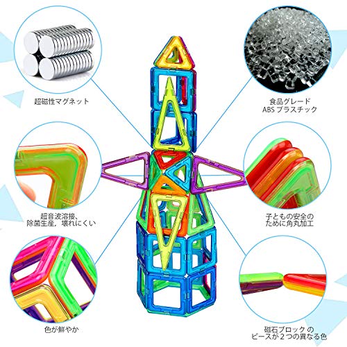 - 【安全・食品級高品質な素材】CE認定済みマグネット おもちゃ、本磁気ブロックおもちゃは食品級のABS材料+天然磁石で作られており、磁力がとても強いだから、長時間経っても磁力が弱くなりなく、角が丸くのデザインで、怪我を心配要りません。子供が噛んだりしてもいいので安心して遊べるマグネットおもちゃです。