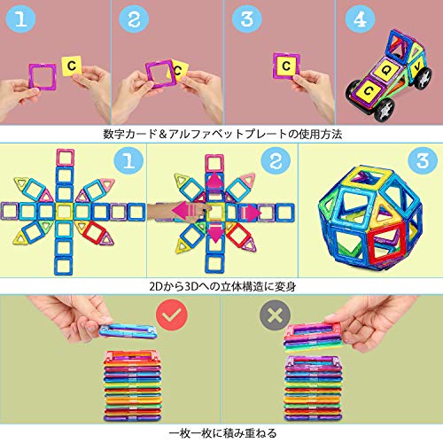 - 【学習・知育玩具として】創造力・色識別能力・認識力・想像力・空間視覚能力・実践能力をを刺激して知育マグネットブロック玩具です。磁石ブロックは可愛いデザインと豊富なカラー新鮮感があって、子供を誘て遊んで、夢中で楽しく遊びながら子供の想像力、創造力、集中力、色識別能力や空間視覚能力を育て、さまざまな力が身につきます。