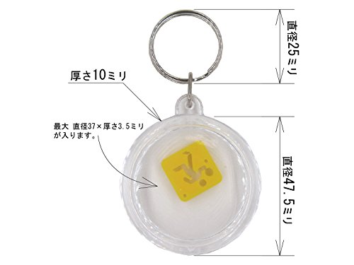 ・アクリル製キーホルダーのブランクです。ご自身で好きなアート作品等を入れることができます。 ・中に入れることのできる最大サイズは直径37mm×厚さ3.5mmです。 ・厳密には蓋を占めたときの内部の形状は単純な円柱状ではないのですが、複雑になるのでここではそのように提示いたします。 ・10個の出品です。価格は10個セットの価格です。 ・キーホルダー大きさ:直径48ミリ、厚さ10ミリ、Oリング外径25ミリ、重さ約12グラム。 ・アート作品を入れてふたを閉めた後、接着剤を使って蓋を留めてしまう方が安心かと思います。 ・微妙なスリ傷等あります。蓋の端に樹脂を射出成型した時のゲートのバリが残っています。 ・このバリを削ってしまうと蓋がゆるくなる可能性があります。削らない方がよろしいかと思います。なお、蓋をはめてしまうとそのバリはあまり目立ちません。 ・外観上問題のある物(例えば傷が深い等)はこちらの判断で入らないようにいたします・ ・個々に微妙に外観上の違いがあります。ご了承ください。