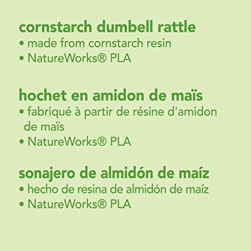 Made from PVC free and BPA free materials;Classic dumbbell shape is easy for baby to grasp and shake;Made from cornstarch resin;Nature works PLA (cornstarch bio plastic);Surface wash with mild soap and warm water of a temperature less than 140 degree F and above 4 degree F; Do not immerse or soak in water; Shake gently, dry with soft cloth