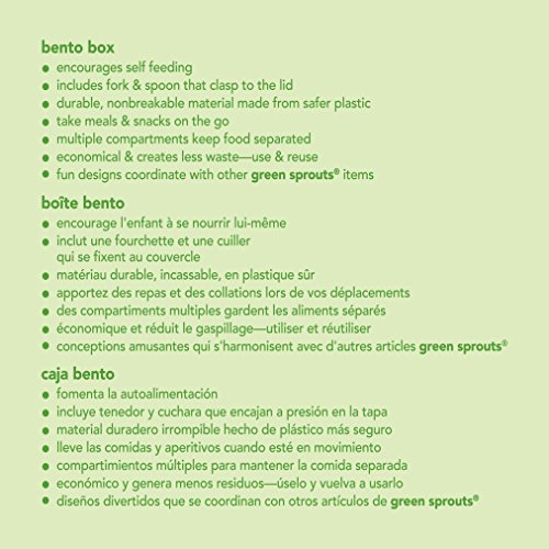 Makes healthy eating fun and encourages self feeding;Take meals and snacks on the go; set includes fork and spoon that clasp to the lid;Durable material made from safer plastic;Multiple compartments keep food separated with a total size of 6.5 x 4.5 x 2.75;Economical and creates less waste -- use and reuse with other fun designs that coordinate with various green sprouts items