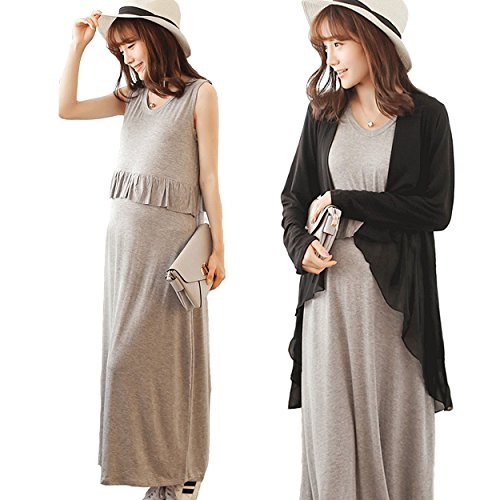 greenleafbaby(グリーンリーフベイビー) マタニティ ワンピース カーディガン 授乳口 フリル 妊婦服 (XL, グレーワンピース黒カーデセット)