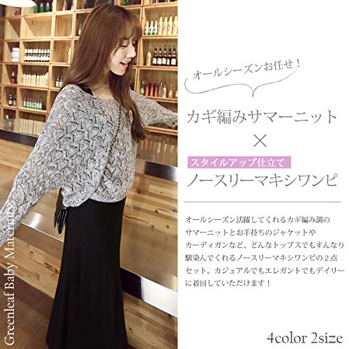 透かしニットとマキシワンピースがセットになったマタニティウェアです!授乳口が付いているので産前産後で長くお使えになれます。 おしゃれな杢カラーデザイン編みニット&マキシワンピースです。マタニティ服らしくなく、もちろんマタニティ以外でもお使えになれます。 【素材】綿 95% ポリウレタン5% 【サイズ】M:バスト94-98cm長さ:106cm 春先~夏にかけて大活躍間違いなしのワンピースです。温度調節が重要な妊婦さんにうれしいアンサンブルなので、それぞれを脱ぎ着して温度調整ができます。 レイヤードスタイルで授乳口が見えなく、マタニティ服に見えないワンピースです。