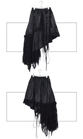 うろこ状の生地、レース、スピンドル、あらゆる要素が取り込まれた贅沢な変形スカート! モード系にも合うオールブラック