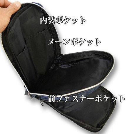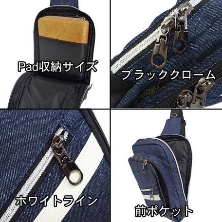 デニム生地を使用した定番製品のボディバッグ。 本体には4ポケット分の収納口を装備し、前ポケット1は25cmの幅を備え、スマートフォン等を楽々収納できるポケット。 前ポケット2は財布を収納できるサイズ。 メーンポケットはiPad miniや書籍や手帳等を収納できる内装ポケットを備える