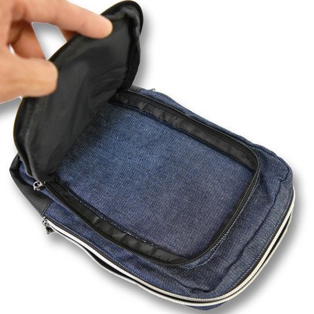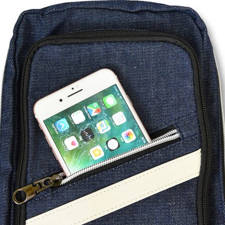 - 本体には4ポケット分の収納口を装備し、前ポケット1は25cmの幅を備え、スマートフォン等を楽々収納できるポケット。