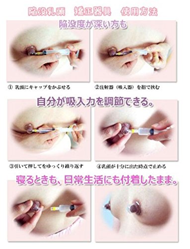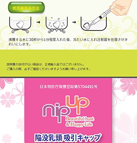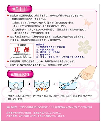 商品構成の中身、 1.特許取得キャップ1個 ,,, ,,, 2.中間ノズル2個,,, 3.注射器(サービス品),,, 4.保管ケース,,,, 5.スプレーボトル(キャップを濡らす為に使用)、、、、 正規品の証明として掲載のピンクの説明書付き 乳頭陥没矯正商品の選び方法 1>いい商品を選ぶ 重要な事は吸引力を第一に考えてください。 この商品の良さは他の商品は吸入力が限界がる商品と違い、吸引を強弱の調節できます 陥没度が深い方、確実に矯正を希望するなら ある程度の吸引力は必要です。 吸収力が限界があると深い陥没は吸収できない事で在りますから、 そして、吸収力あるとしても 毎日、服を抜いて2-30分するものは 毎日、手間をかけ、同じ動作を繰り返すのは ストレスになり、人は諦める事になります。 この商品はcapを載せ、10-20秒で吸引し、 普通の生活をしてもいいし、 したまま寝てもいいです。 外出してもいいですし、会社でも使用できる、 そして、次の点 は 決まった吸入力しかない 簡単に吸引力が限界がある商品 、玩具のような商品で おもちゃのような矯正器具で直せるなら、、 病院の整形外科で手術をする人が いなくなります。 この商品は他社の商品と比べ、やや高めですが手術の費用を考えると安いですので、ほんとに良い効果を期待すなら、この商品を推薦します。 2>24時間、好きな時間に付けて服を着たまま、動けます。会社に も付着したまま行ける便利さ!! 長くなっている陥没が家で2-3分して矯正できると判断できません。 長くつけて、いつでも矯正できる商品ではないと 矯正ができません、。 本当に乳頭陥没を矯正するに、本当に効果的な商品は 何かに迷うと貴方に!! この商品を選択してください。