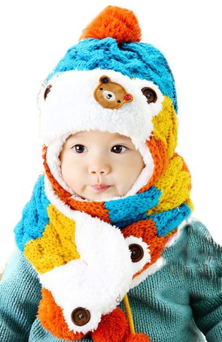 3色 クマ ニット帽 ニット帽子 ベビー キッズ 赤ちゃん 子供 かわいい 防寒 耳当て マフラー (ブルー)