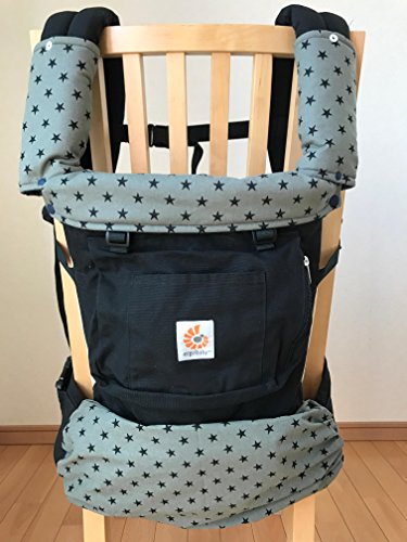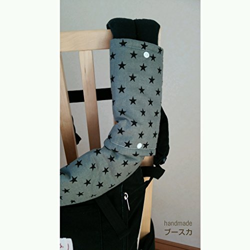 抱っこ紐に装着するショルダーパッド・ネックパッド・収納カバーの3点セット♪ ☆赤ちゃんが舐めてしまうショルダー部分をカバーしてくれるショルダーパッド ☆寝汗を吸収し首回りを優しく保護するネックパッド ☆かさばる抱っこ紐をくるっと丸めて収納できる収納カバー 3つお揃いの柄でおしゃれ感覚で楽しめます。 裏はデニム柄(ネイビー)でリバーシブル、パパ装着時もシンプルに決まります。 すべてプラスチックスナップボタンでの取り外しだから金属アレルギーの方にも安心です。 *ショルダーパッド・ネックパッド* 表布(星柄)綿100% 中布 キルト芯・ドミット芯 裏布(デニム柄)ダブルガーゼ *収納カバー 表布(星柄)綿100% 裏布(デニム柄)綿65%ポリエステル35%