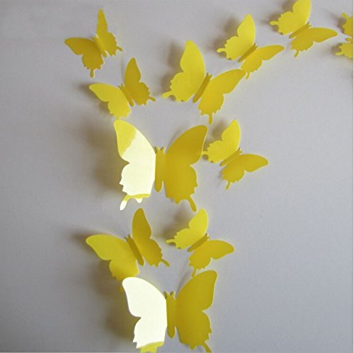 12pcs DIYカラフルデカール3dバタフライウォールステッカーアートPVC紙装飾子供リビングルーム装飾キッチンバスルーム^イエロー。