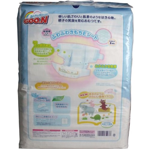 - 敏感肌にもやさしい、ふわふわきもちEシート! 優しい肌ざわりと肌着のようなはき心地! ママの手みたいに、ふんわりやさしい! 1.ふわふわきもちEシートが、なめらかで肌にやさしい。 2.空気を含んだ「ふかふか空気層」が、ふわふわでやわらかい! 3.3Dエンボス加工で赤ちゃんのお肌の負担軽減。シートのくぼみが軟便をしっかり吸収! 4.おしっこ お知らせマークつき。 5.全面通気性バックシート使用。 【適用】 体重6~11Kgまで 【素材】 表面材・・・ポリオレフィン系不織布 吸水材・・・綿状パルプ、吸収紙、高分子吸水材 防水材・・・ポリオレフィン系フィルム 止着材・・・ポリオレフィン系フィルム 伸縮材・・・ポリウレタン 結合材・・・スチレン系合成樹脂 等