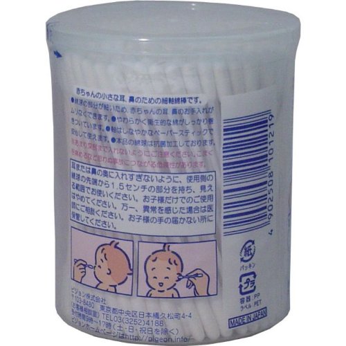 赤ちゃんの小さな耳、鼻のための細軸綿棒です! 綿球の部分が細いため、赤ちゃんの耳、鼻のお手入れがムリなくできます。 やわらかく衛生的な綿がしっかり巻きついています。 ・軸はしなやかなペーパースティックで安心して使えます。 ・ベビー綿棒の綿球は抗菌加工しております。 【使用開始月齢】 0ヵ月から 【ご使用方法】 ・とり出すときは、中央のつまみを軽くもち上げてください。 【注意】 ・あまり深部まで入れないようにご注意ください。こまくを痛めるなどおもわぬ事故に繋がる危険性があります。 ・耳または鼻の奥に入れすぎないように、使用側の綿球の先端から1.5cmの部分を持って、見える範囲でご使用下さい。 ・お子さまだけでのご使用はやめてください。 ・万一、異常を感じた場合は、医師にご相談下さい。 ・お子様の手の届かないところに保管してください。