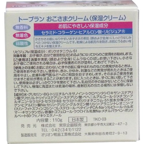 「トプラン おこさまクリーム 110g」は、お肌にやさしい成分たっぷりの保湿クリームです。かさかさお肌になりやすいお子様の素肌(顔および全身)にしっとりなじみべたつかない保湿クリームです。乾燥による肌荒れを防ぎ、お肌にうるおいを与えキメを整えます。 セラミド、コラーゲン、ヒアルロン酸、リピジュア(ポリクオタニウム-51)配合。無香料、無着色、弱酸性。対象年齢1歳以上。 お問い合わせ先 株式会社 東京企画販売:042-341-1122 使用方法 適量を素肌(顔および全身)にムラなくのばしお使い下さい。 使用上の注意 ●お肌に合わないときやお肌にキズやはれものなど異常があるときは、ご使用をおやめ下さい。 ●使用中、赤み、かゆみ、刺激などの異常が現れたときはご使用を中止し、皮膚科専門医などへのご相談をおすすめします。そのままご使用を続けますと症状が悪化することがあります。 ●目に入ったときは、すぐに洗い流して下さい。 ●使用後は必ずしっかりフタを閉めて下さい。 ●乳幼児の手の届かないところに保管して下さい。 ●極端に高温または低温の場所、直射日光の当たる場所には保管しないで下さい。 成分 水、グリセリン、BG、トリ(カプリル/カプリン酸)グリセリル、シクロペンタシロキサン、ステアリン酸グリセリル、トリイソステアリン、ステアリン酸、ベヘニルアルコール、ジメチコン、アルギニン、セラミド3、セラミド6II、セラミド1、ポリクオタニウム-51、加水分解コラーゲン(魚皮)、ヒアルロン酸Na、セリン、グリシン、グルタミン酸、リシン、アラニン、トレオニン、プロリン、フィトスフィンゴシン、コレステロール、ベタイン、PCA-Na、ソルビトール、カルボマー、キサンタンガム、ラウロイル乳酸Na、メチルパラベン、ポリソルベート60、フェノキシエタノール 原産国 日本