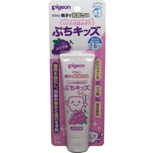 - 離乳食を卒業したら、ぷちキッズで歯みがき! 歯の汚れやむし歯が気になってくる、離乳食卒業の頃から! 1才6ヵ月頃からの乳歯の性質を考えてつくられたジェル状歯みがきです。 ・歯の再石灰化を促進し歯質を強化する薬用成分フッ素(フッ化ナトリウム)配合。むし歯の発生と進行を予防します。 ・むし歯の原因となる酸をつくらないキシリトール配合(湿潤剤)。 ・デリケートな乳歯を傷つけにくい、ソフトな清掃剤(無水ケイ酸)使用。 ・発泡剤無配合で泡立たず、すみずみまでていねいにみがけます。 ・ほんのり甘い、ぶどう味。ミントタイプの香料不使用で、赤ちゃんが嫌がりません。 ・着色料無添加。 【医薬部外品】 【成分】 基剤:精製水 湿潤剤:キシリトール、PG 清掃剤:無水ケイ酸 粘結剤:カルボキシメチルセルロースNa 薬用成分:フッ化ナトリウム 保存料:安息香酸Na、エチルパラベン 香味剤:香料(ぶどうタイプ)