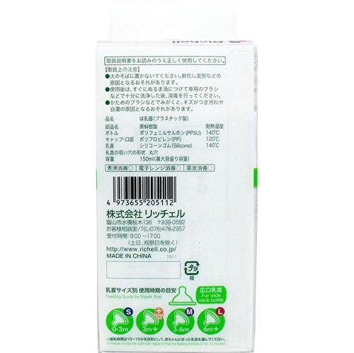 - 【サイズ】6.3X6.7X12.5H(cm) 【最大目盛り容量】150mL 【材質】 ボトル・・・ポリフェニルサルホン(PPSU) キャップ・口部・・・ポリプロピレン 乳首・・・シリコーンゴム 【消毒方法】電子レンジ・煮沸・薬液消毒:OK 【乳首の吸い穴の形状】丸穴 【耐熱温度】パッケージ側面にてご確認ください。