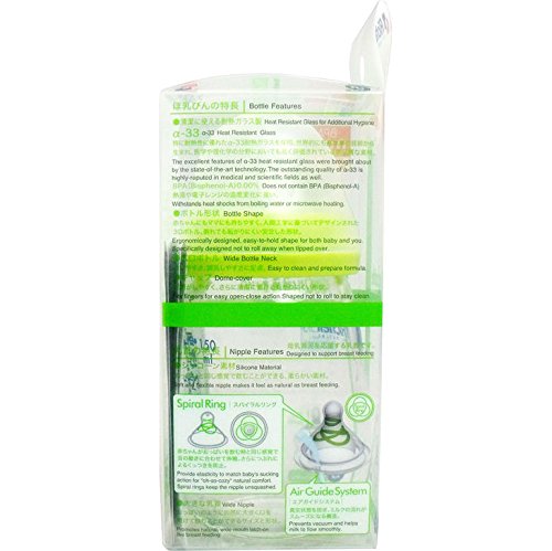 - 【材質】 ボトル:ほうけい酸ガラス キャップ・口部:ポリプロピレン 乳首:シリコーンゴム 【消毒方法】電子レンジ・煮沸・薬液消毒・・・OK 【乳首の吸い穴の形状】丸穴 【耐熱温度】パッケージ側面にてご確認ください。