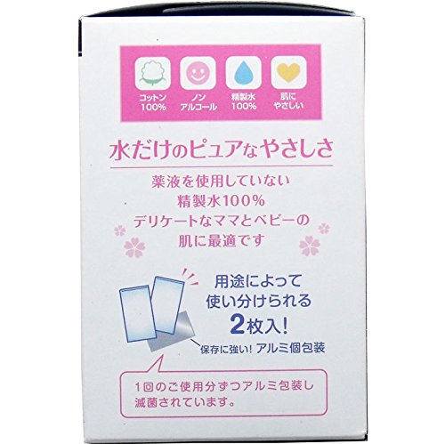 水だけのピュアなやさしさ♪精製水100%で敏感なママやベビーにやさしい!薬液を使用していないのでデリケートなママとベビーの肌に最適です。精製水100%含浸、2枚入・単包滅菌済ウエットコットンです。アルコール・香料は使用していません。やわらかコットン仕様!敏感肌にもやさしい脱脂綿を使用しています。清潔な滅菌済個包装!授乳時の乳房の清浄・清拭に1枚ずつ使用できます。アルミ個包装が水分の蒸発を防ぎ、常に清潔な状態で使用できます。【素材】医療脱脂綿【成分】精製水:100%【入数】2ツ折2枚入×40包【サイズ】7.5cm×7.5cm【注意事項】・赤み、はれ、かぶれ、かゆみ等の症状が見られたり、刺激を感じた場合は使用を中止し、医師または薬剤師にご相談下さい。・本品は使い捨てです。繰り返し使用しないでください。・手洗い等をして清潔な手でご使用下さい。・水に溶けないため、トイレには流さず衛生的に処理してください。・高温や直射日光のあたる場所を避け、乳幼児の手の届かない場所に保管し、開封後はなるべく早く使用してください。