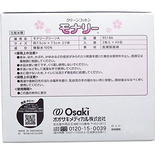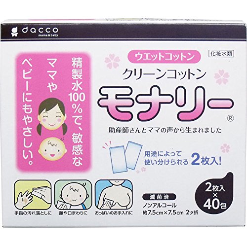 滅菌済個包装ウエットコットン デリケートなママとベビーの肌に最適 清潔 医療脱脂綿 クリーンコットン モナリー ノンアルコール 約7.5cm×7.5cm 2ツ折 2枚入×40包入【1個セット】
