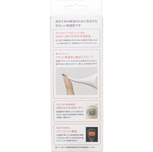 - 平均15秒のスピード検温の、赤ちゃんのための体温計! お子様の検温のために生まれたやさしい体温計です!! 先端が柔らかく曲がるやわらかプローブなので、乳幼児の検温が安心! お子様がぐずる前にさっと検温、すばやく測れる15秒予測検温! 日時がわかる10回メモリ 検温終了を、ブザーでお知らせ 携帯・保管に便利な収納ケース付 電池交換が可能 暗いところでも見やすいバックライト 子どもを起こさず測定できる、ブザー音オフ機能