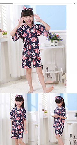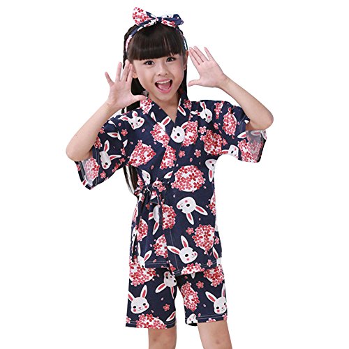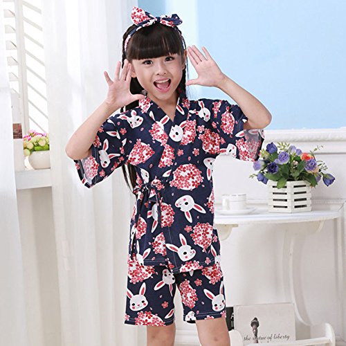 hibote 春夏 パジャマ 甚平 子供服 着物 お祭り 上下セット 女性用 バスローブ 浴衣式 前開き Vネック 花柄 120cm-130cm 半袖 おしゃれ 着物 ナイトウェア 兔子 M