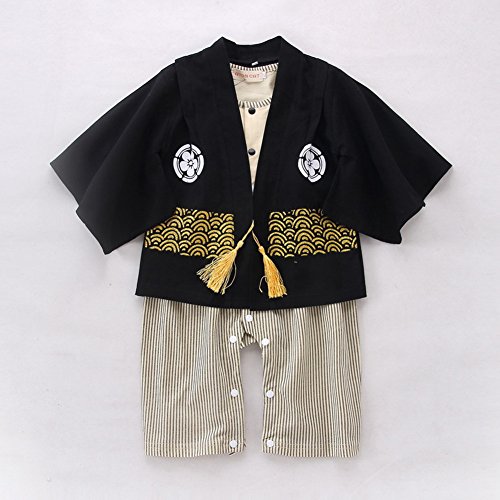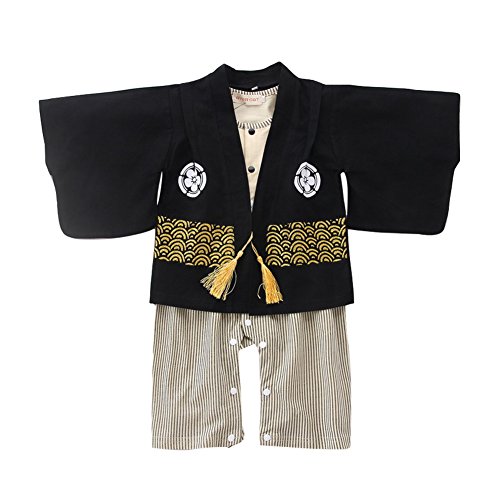 hibote 紋付袴風 袴 子供服 ロンパース ベビー和服 着物 9ヶ月-12ヶ月 長袖 二件セット 高品質 お食い始め 七五三 子供の日 和装 フォーマル キッズ 夏祭り ブラック