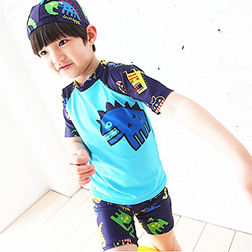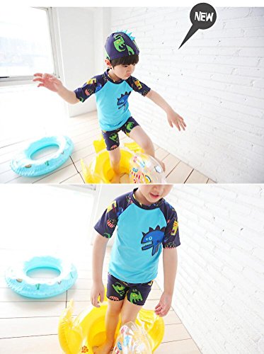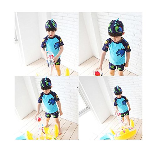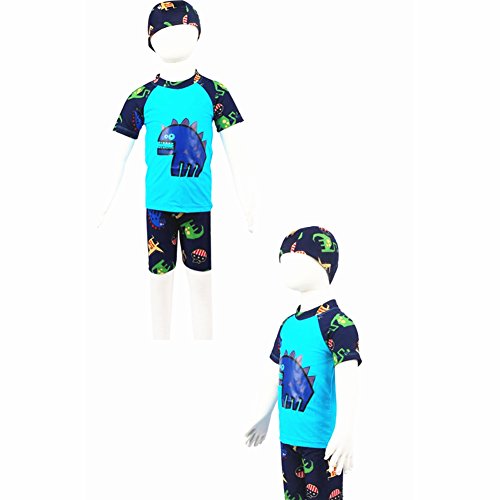 hibote 男の子 水着 2-13歳 ラッシュガード &キャップ付 水着上下+帽子 3点セット UVカット 恐竜アニメ ブルー XL