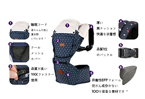 - 【便利な機能】■ヒップシートの中身を取り出せば洗濯機で丸洗いOK(弱水流・水洗い・つり干し/塩素・漂白剤・アイロンは使用しないでください) ■ウエストベルトには携帯・カードが入るサイドポケット付 ■こどもが寝たときの首カックン防止や風・直射日光除けに便利なスリーピングフード付 ■こどもが直接触れても安心なオーガニックコットン100%のベルトカバー付