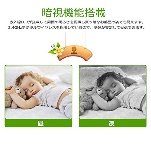 - 【暗視機能搭載】 ベビーカメラは8個高輝度の赤外線LEDが搭載して周囲の明るさを認識し真っ暗なお部屋の姿でも見えます。そして2.4GHzデジタルワイヤレスを採用しているので、映像が安定して受信できます。赤ちゃんや子供達、介護の必要なお年寄りやペットの姿を簡単に見え、誰もいない部屋から物音も聞こえ、セーフティーを確保できます。