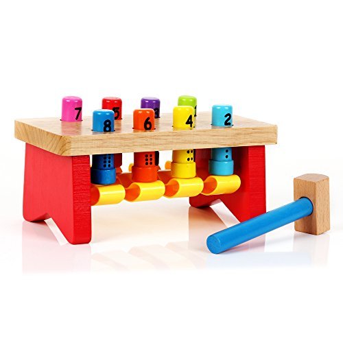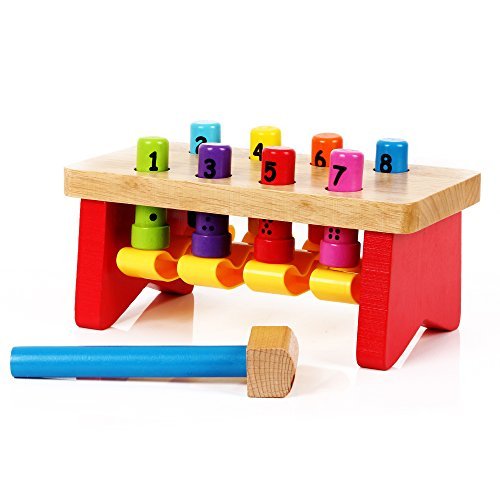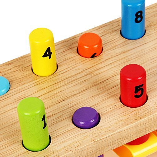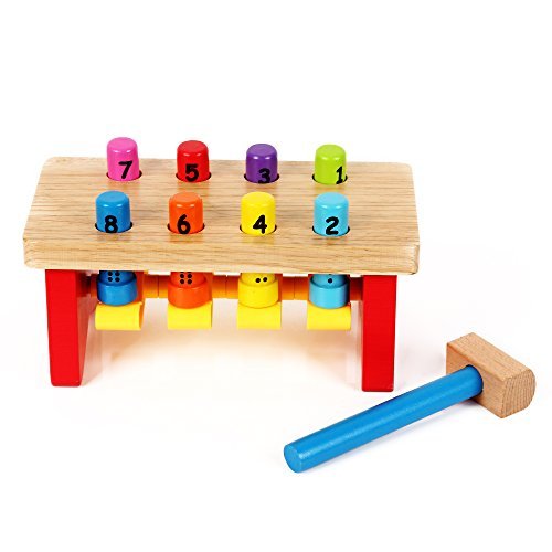 Children improve their fine motor skills by using the hammer to hit the pegs and make them go down. Children are also able to learn their numbers, counting and colors in a fun and hands on way. The eight colorful pegs are non-removable so parents don't have to worry about lost pieces and children putting pieces in their mouths.