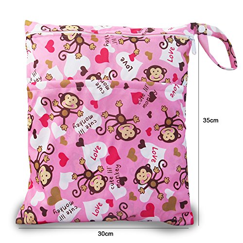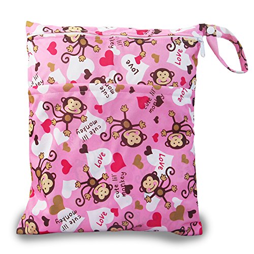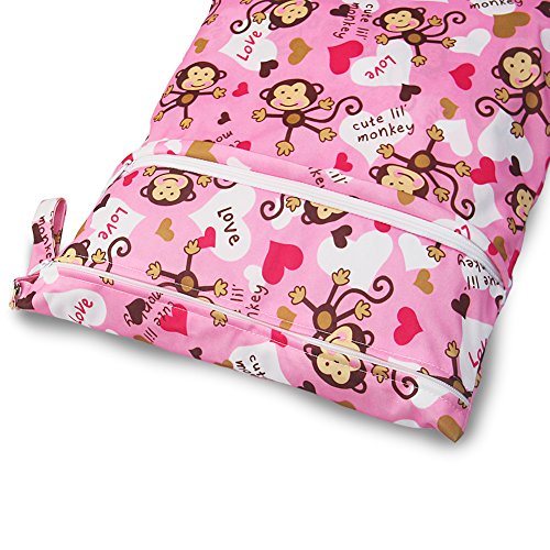 iZivベビー防水再利用可能 ウェットとドライ おむつバッグポーチダブルジッパー印刷おむつ袋(ピンクモンキー)