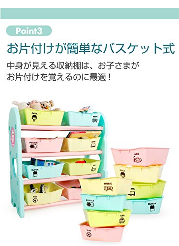 バスケットにポイントステッカーを貼れば、たくさんのおもちゃを種類別に整理することができます。