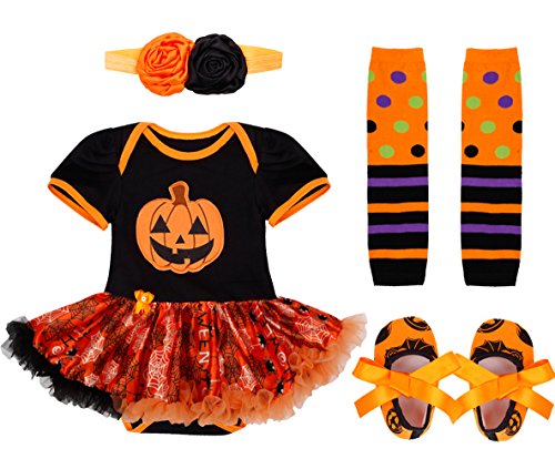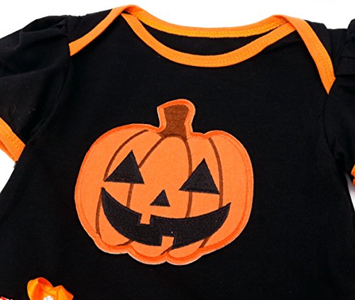 - ハロウィンでおなじみのカボチャ、ロンパース、ヘアバンド、靴、靴下にかぼちゃの色が入ったかわいいデザイン♪オレンジとブラックのツートーンカラーが目を引きます。お子様のハロウィン用コスチュームにオススメ!