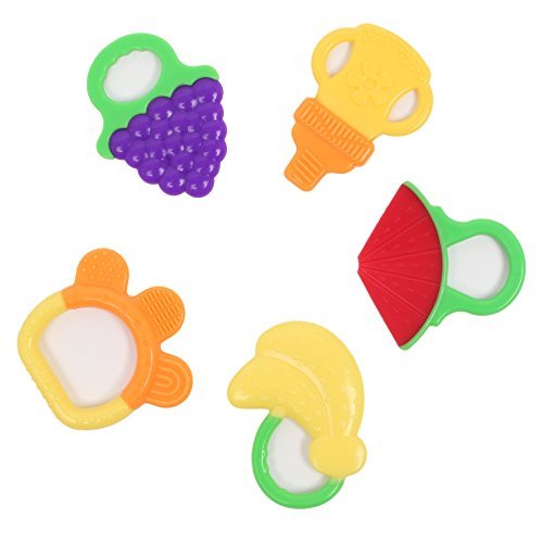 With our new baby teeth relief toys, relieving your child from discomfort will now be easy. ilovebaby present the new baby teeth relief toy which are approved by doctors. Thanks to us your child will no longer suffer pain again.;The toy with funny forms as watermelon, grape, banana, bell or baby bottle which were created to fit perfectly in the baby's mouth for their comfortable use and not causing any choking hazard. Your baby safety is our priority.;We choose the best quality and safest silicone material to create the toys. The material is not toxic, BPA free and FDA approved to ensure that your baby will always be safe and not expose to dangerous chemical you could find in low cost and bad quality product.;We designed all the toys with soft and relaxing textures so this the gum texture will massage your baby mouth to relieve soreness and discomfort.;This pack comes with 5 different baby tooth relief toys so your baby will be able to choose the one he likes.